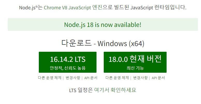 1.1. https://nodejs.org/ko/ 에서 LTS 버전 다운 및 설치