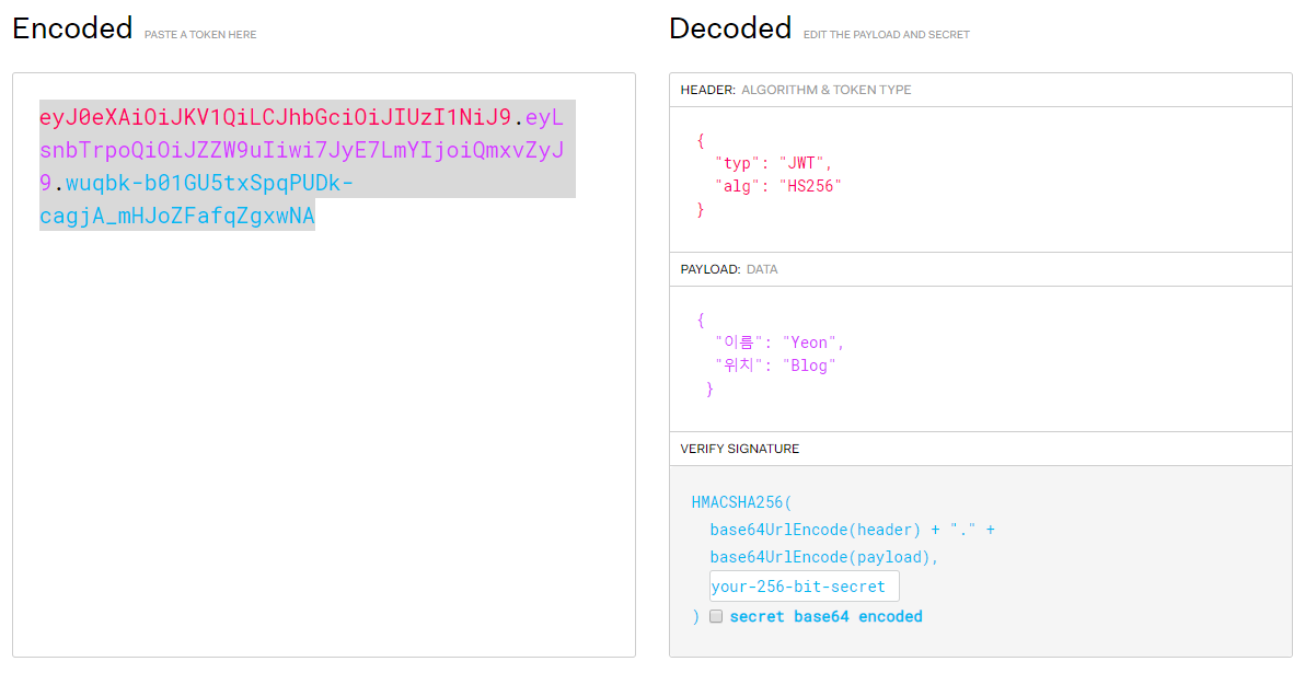 - ex) eyJ0eXAiOiJKV1QiLCJhbGciOiJIUzI1NiJ9.eyLsnbTrpoQiOiJZZW9uIiwi7JyE7LmYIjoiQmxvZyJ9.wuqbk-b01GU5txSpqPUDk-cagjA_mHJoZFafqZgxwNA