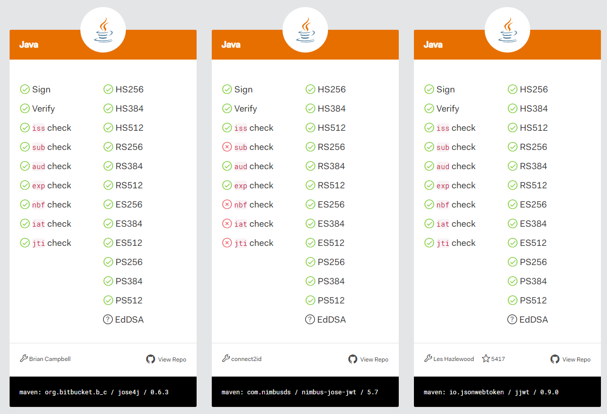 https://jwt.io 메인페이지에서 아래와 같이 언어별 지원하는 암호화 방법 및 라이브러리를 확인할 수 있다.