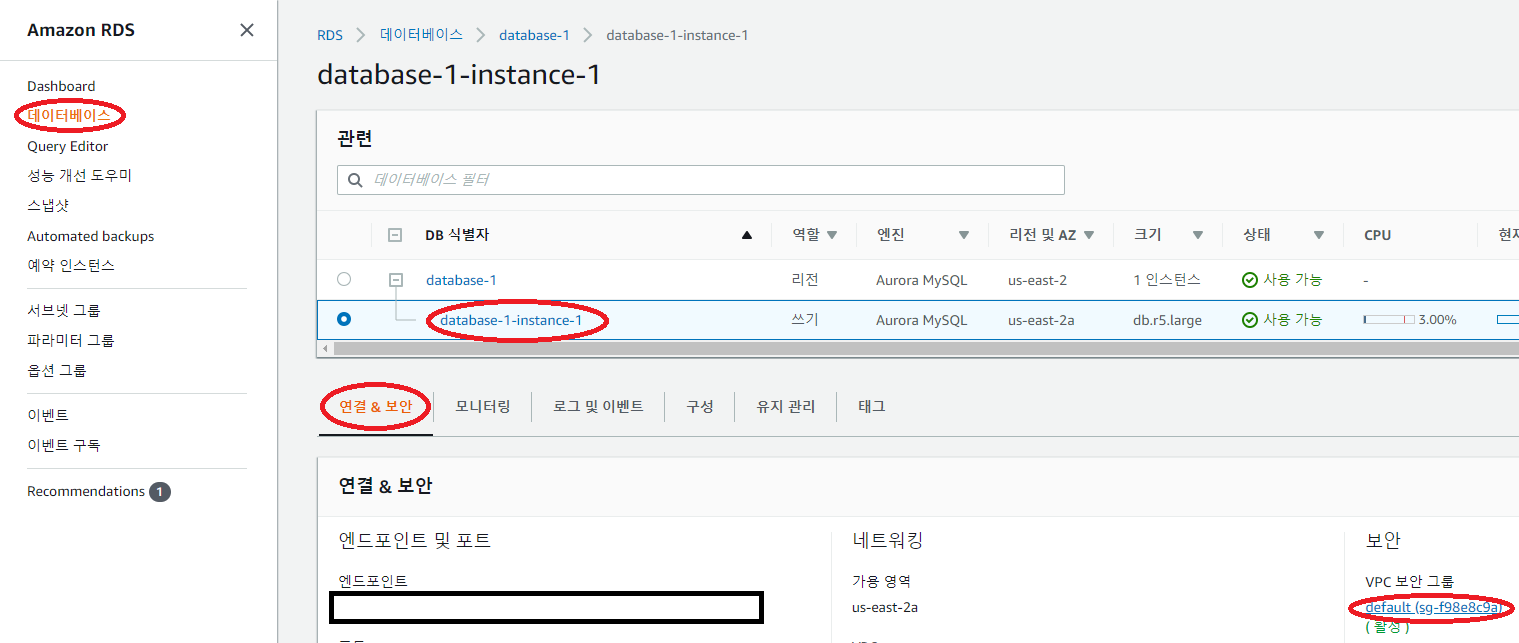 1. Amazon RDS > 데이터 베이스 > 생성한 데이터 베이스 > 데이터 베이스 인스턴스 > 연결 & 보안 텝 > VPC 보안 그룹을 선택하자.