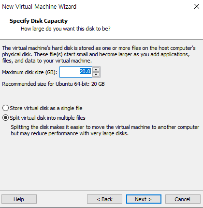 5. 원하는 만큼 디스크 할당 후 Next 선택(Ubuntu 64-bit은 최소 20GB입니다.)