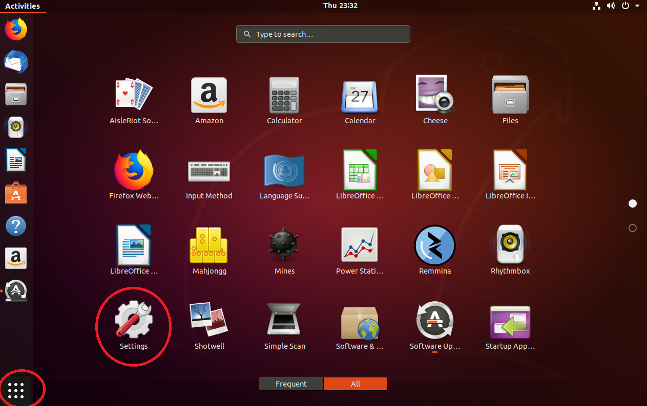 1. Show Applications(왼쪽 아래 점 9개 icon) > Settings 선택