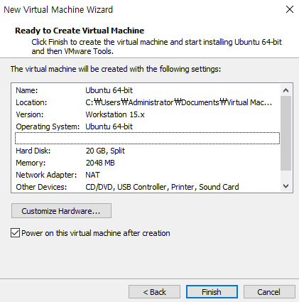6. Hardware를 설정하고 싶으면 Customize Hardware... 선택 / 아니면 Finish 선택