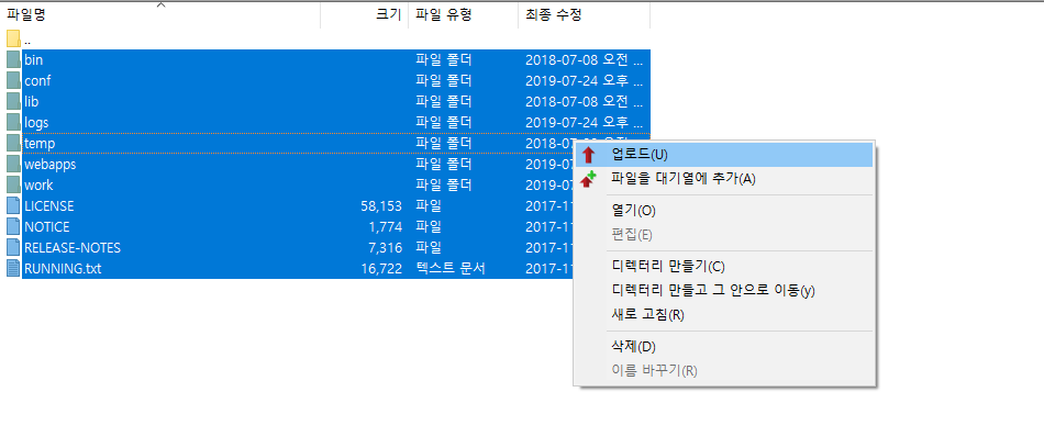 3. tomcat 폴더에서 업로드할 파일을 선택한 후 우클릭 > 업로드를 클릭한다.(압축 파일을 가져가서 해제해도 된다.)