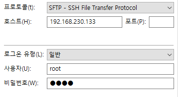 1. FileZilla > 파일 > 사이트 관리자를 선택하여 아래와 같이 정보를 입력 후 연결 버튼을 선택한다.